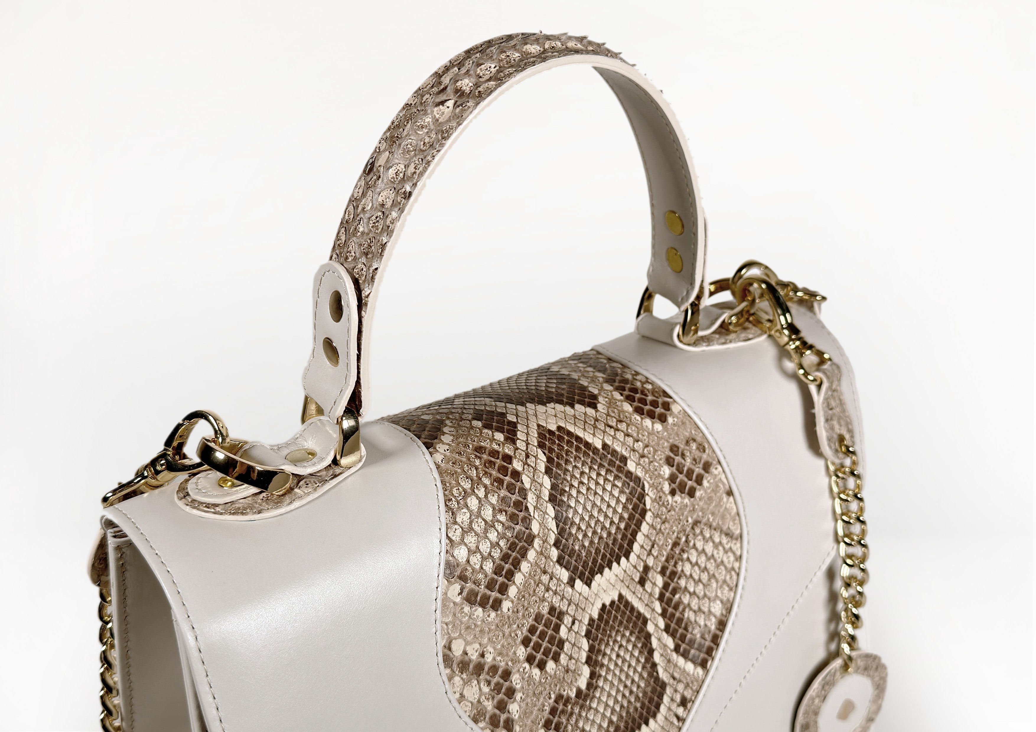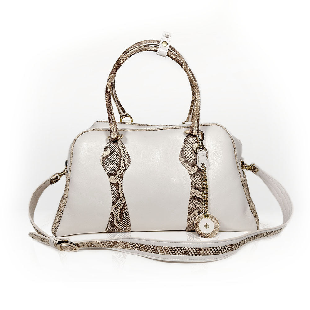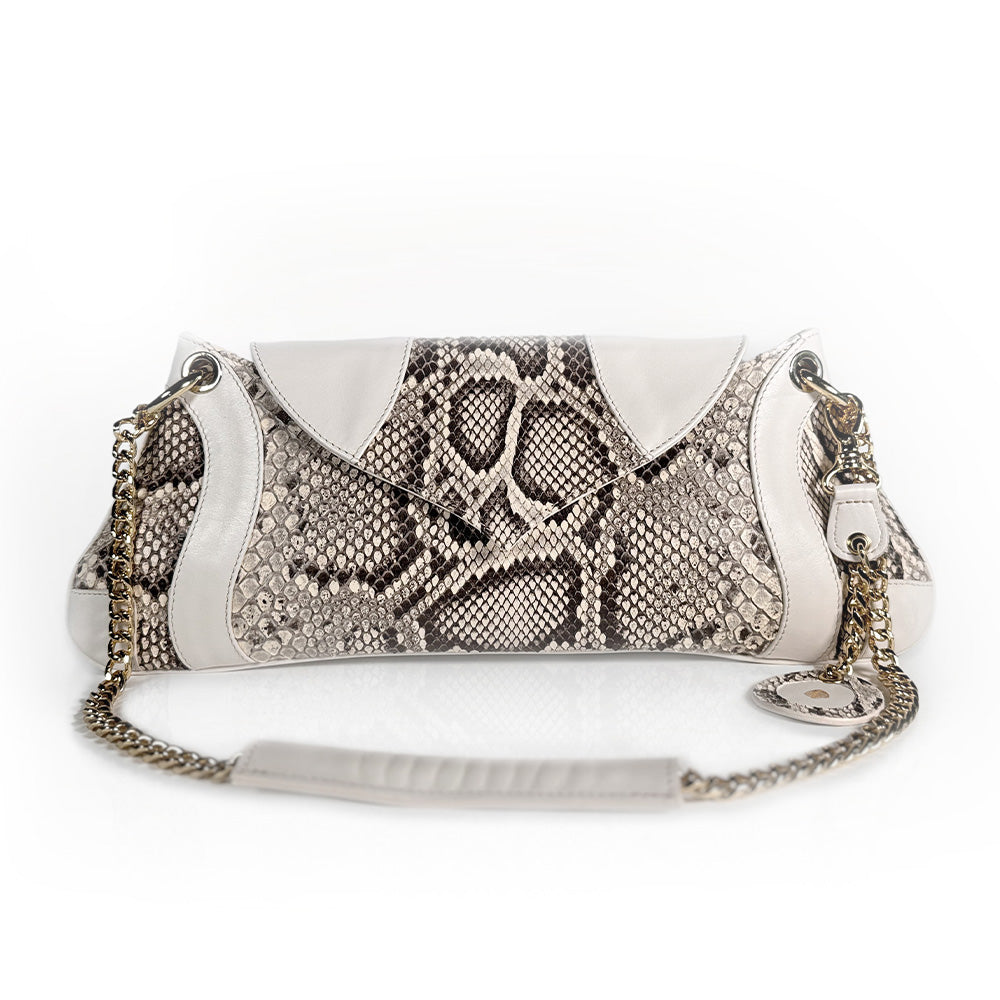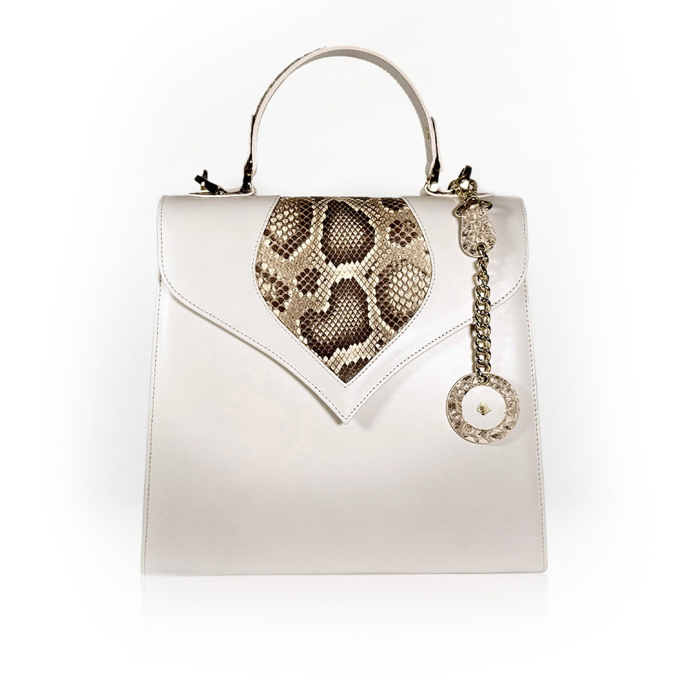 Crafted from fine cream calf leather with a bold natural python insertion, it features a soft caramel leather lining and radiant gold-tone hardware.