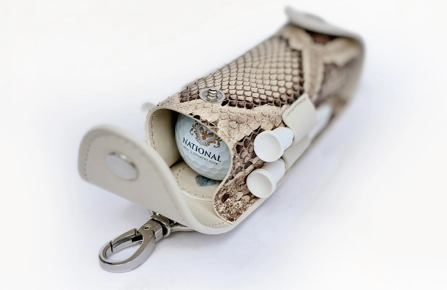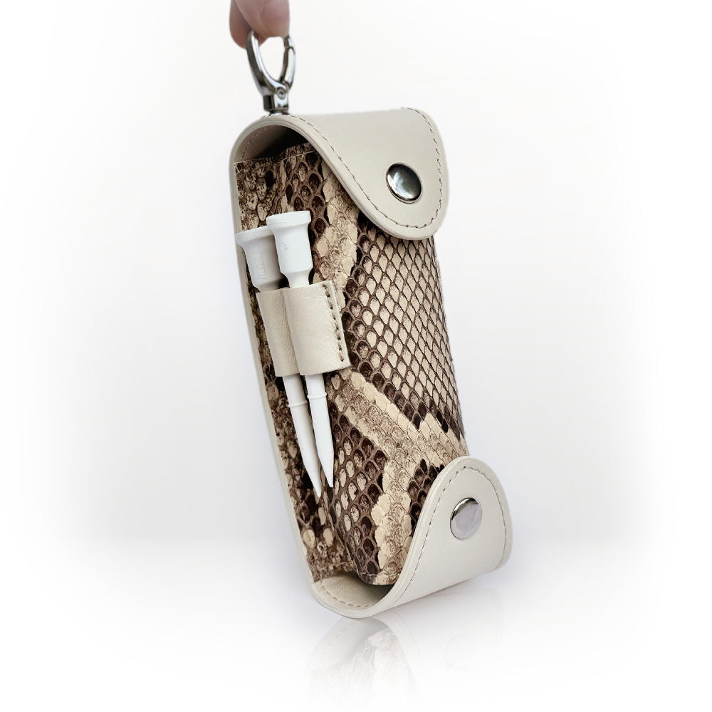 This luxurious Golf Tee & Ball Holder is crafted from premium calf leather and features a stunning natural python leather insert.