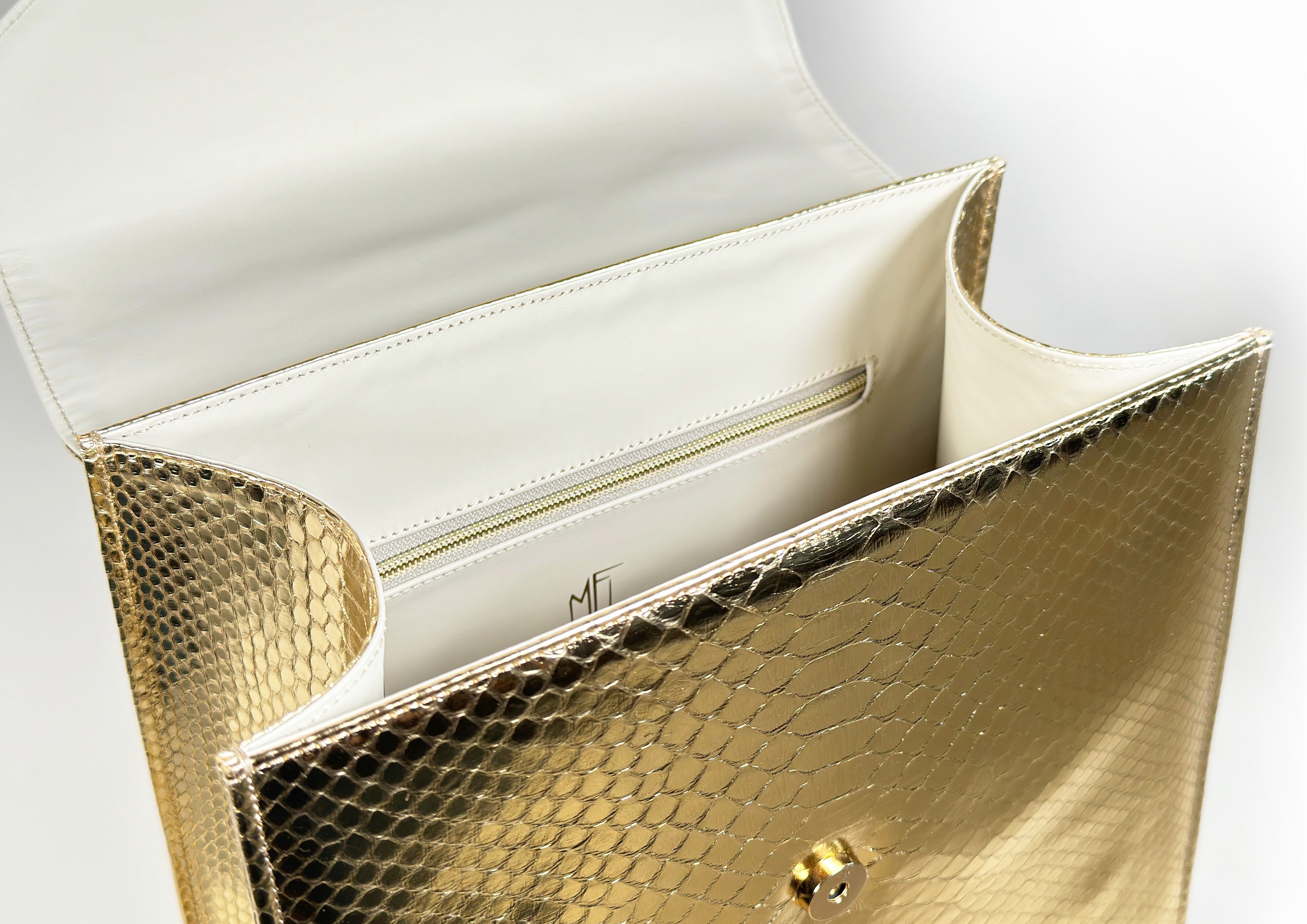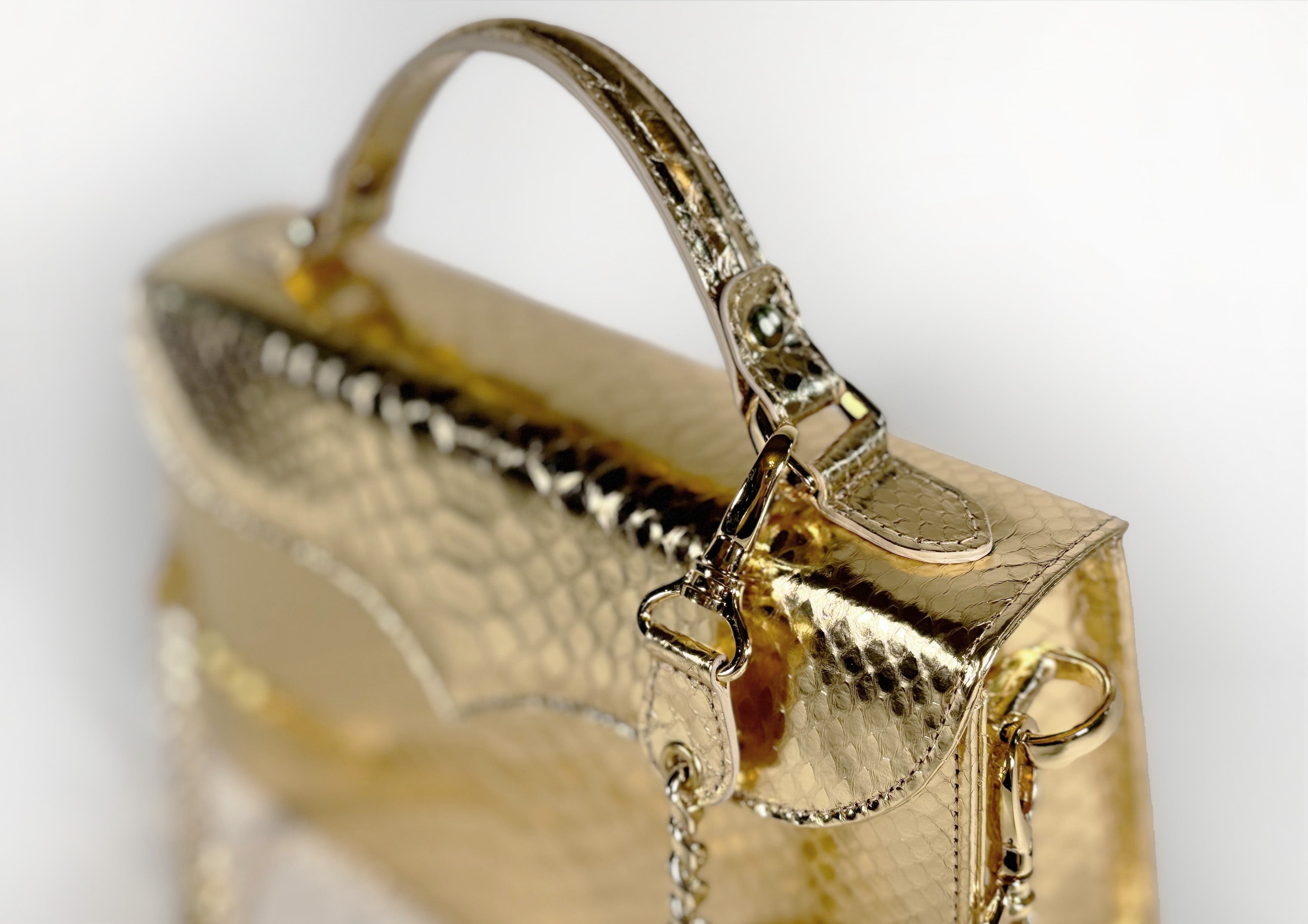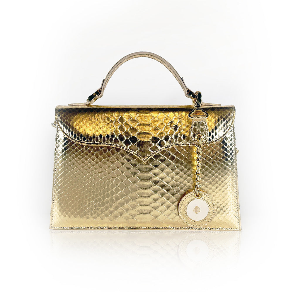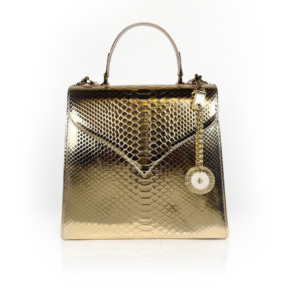 Made entirely from radiant gold python skin, it brings a touch of drama to any look.